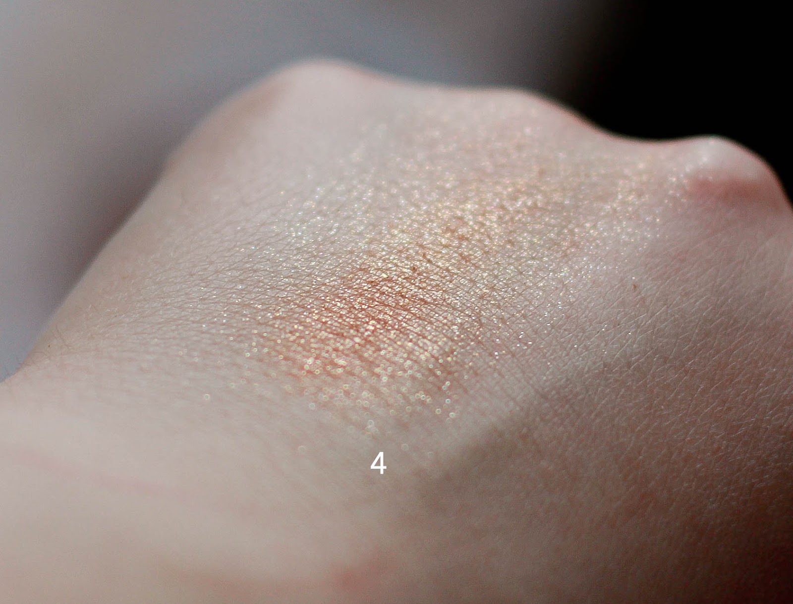 Номер 4 - тени под номером 4 привносят этой вполне повседневной палетке торжественность и праздничность. Золото с большим количеством крупных мягких частичек, напоминает сусальное золото. Легко тушуется и придает взгляду чистое сияние и загадочность. При нанесении не опадает и с легкостью растушевывается в золотистую пелену.
